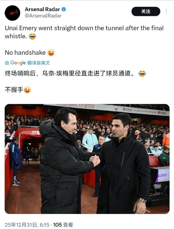 当阿尔特塔和助教击掌相庆后,准备找到埃梅里握手时,他的西班牙前辈已经消失无踪。