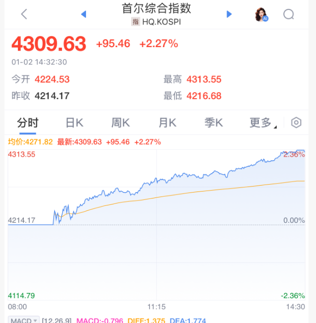 在三星电子股价大涨7.2%,并创下历史新高的带动下,韩国综合股价指数上涨2.3%,首次突破4300点整数关口,最终收于4309.63点。